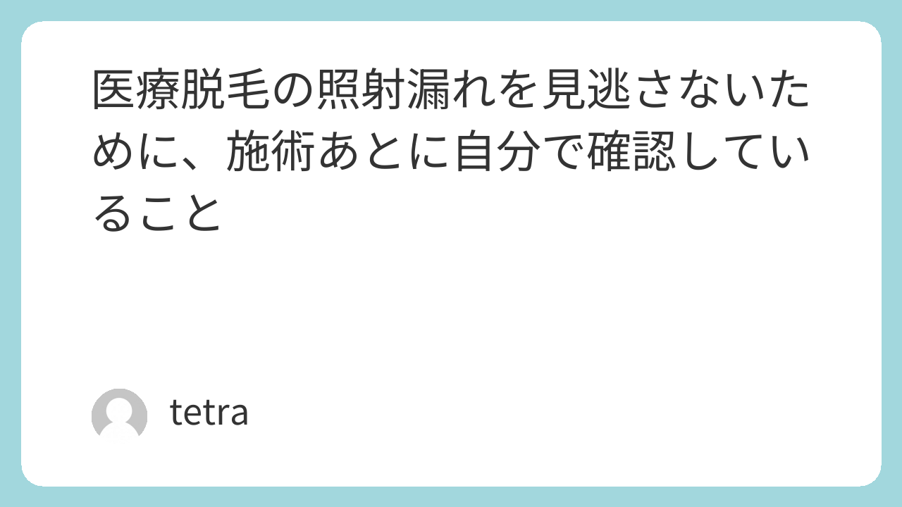そのなかで意識しているのが、照射の漏れです。ここで言う漏れは、スタッフのミスだけを指すつもりはありません。体の曲面、当日の肌の状態、前処理の剃り方、照射の当て方の個人差など、理由はいろいろあり得る、という前提で書きます。僕にとって大事なのは、次の来院まで気づかないまま過ごす時間を減らすことでした。