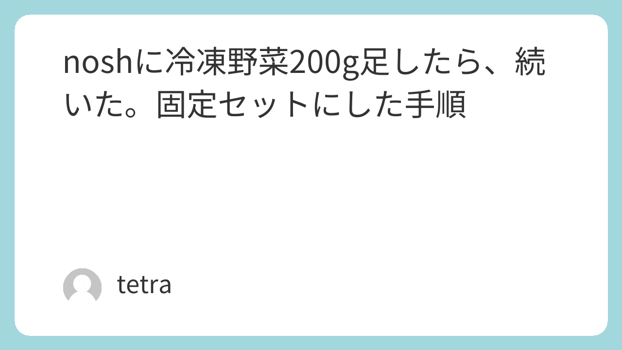 完璧な献立より、毎日同じに近い型を作るほうが、僕には合いました。noshに冷凍野菜200g足す、というルールは地味ですが、記録で見えた欠けを埋めるのに効いたので、いまの生活ではずっとメインで回している「鉄板」に近い安定感があります。