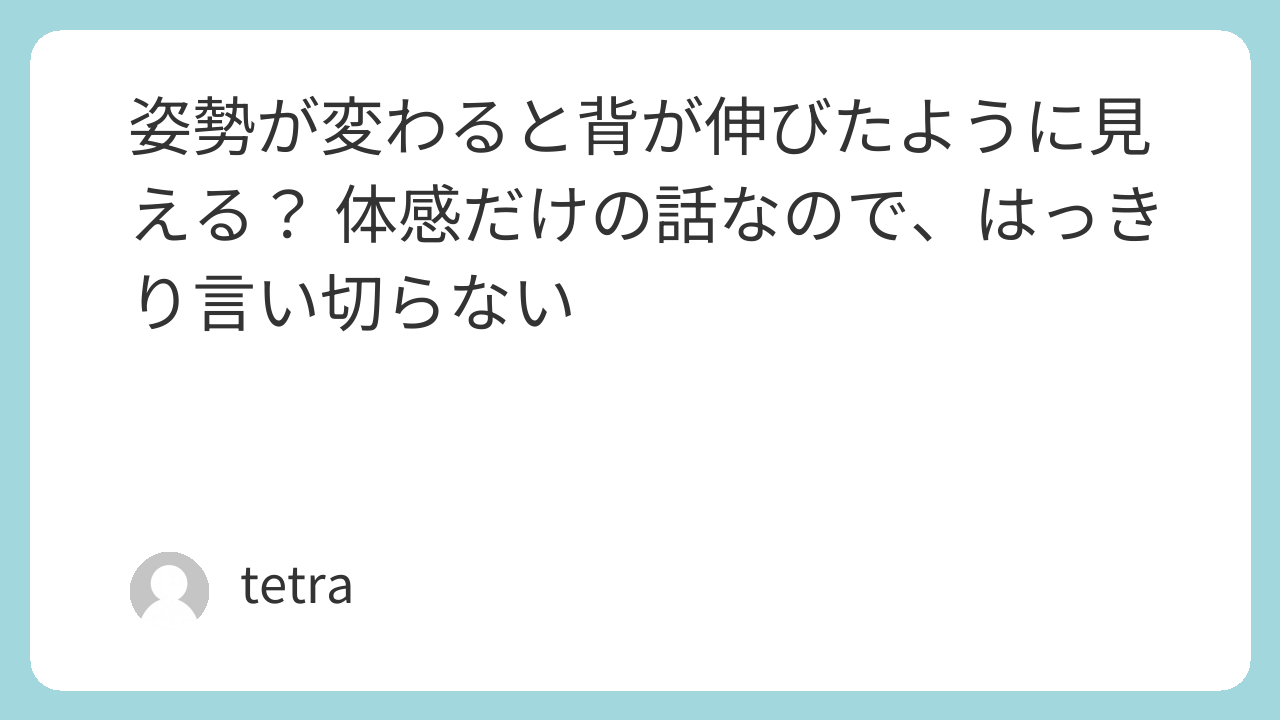 この記事で書きたいのは、 背が伸びた という事実ではなく、 背が伸びたように感じた/見えた という体感です。身長計に乗って数字が増えた、というログは僕は持っていません。ここを曖昧にすると誤解が生まれやすいので、最初に切り分けます。