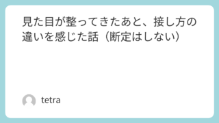 美容 見た目が整ってきたあと、接し方の違いを感じた話(断定はしない) 先に断っておくことこの記事で書くことは、すべて僕の主観と記憶です。相手の本音や、本当に態度が変わったのかは、僕には証明できません。むしろ、自分の見方が変わっただけの線も十分あります。それでも、ログとして残しておきたい揺れがあったので、正直に... 2026.03.22 美容