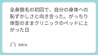 美容 全身脱毛の初回で、自分の身体への恥ずかしさと向き合った。がっちり体型のままクリニックのベッドに上がった日 美容の話なのに、最初に来たのは「場違い感」だった僕が医療脱毛を始めたとき、身体はまだがっちり寄りでした。体重は 82kg前後、体脂肪率も27%前後 のスタート地点に近い時期です。鏡を見るたびにダサいと感じていたし、着たい服も入らないことがあ... 2026.03.22 美容