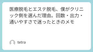 美容 医療脱毛とエステ脱毛、僕がクリニック側を選んだ理由。回数・出力・通いやすさで迷ったときのメモ 比較記事みたいに書くつもりはなかった脱毛を始める前、僕はネットで「医療脱毛 エステ 違い」みたいな見出しを何度も見ました。表にまとまっているページほど、読み手によって前提が違うと感じました。法律上の区分や機器の種類は調べれば出てきます。でも... 2026.03.22 美容