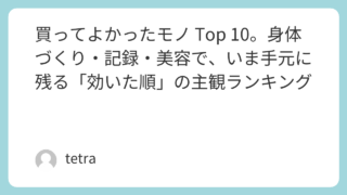 起動プロセス 買ってよかったモノ Top 10。身体づくり・記録・美容で、いま手元に残る「効いた順」の主観ランキング この記事の位置づけ前の回で、身体づくりにいくら使ったかを税込み・約ベースで並べました。今回は金額順ではなく、いま振り返って「買ってよかった」と胸を張れるモノとサービスを、主観で十個に絞ります。順位は「感動の大きさ」だけではなく、生活の地続き... 2026.03.22 起動プロセス